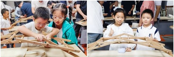 为了让小朋友们更直观地了解竹材的结构特性,本次活动特别设置了搭建竹结构模型的环节,这一充满趣味的实践任务瞬间点燃了孩子们的热情,各组小朋友迅速开始拼接部件,现场气氛热烈,展现了孩子们的创造力与团队协作能力。最终率先完成搭建的6组小朋友赢得了优胜奖品,收获了满满的成就感。