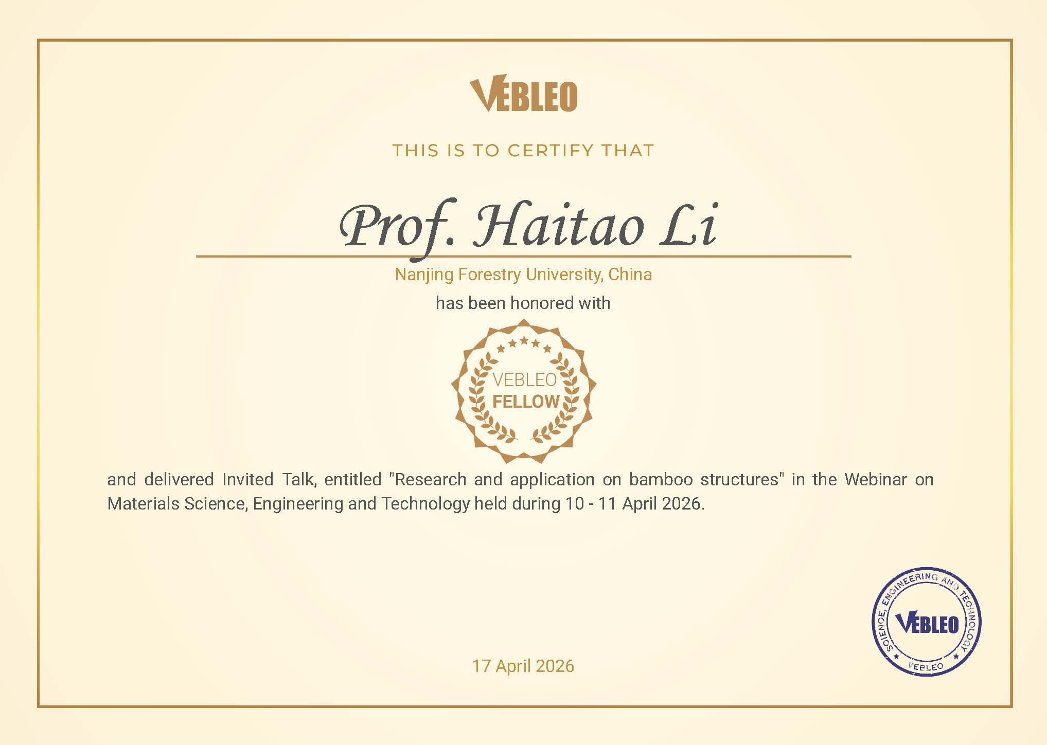 近日,李海涛教授被授予国际科学组织Vebleo协会会士(Vebleo Fellow),并受邀在Vebleo主办的材料科学-工程-技术网络研讨会(Webinar on Materials Science, Engineering and Technology)上作题为“Research and application on bamboo structures”的大会邀请报告。